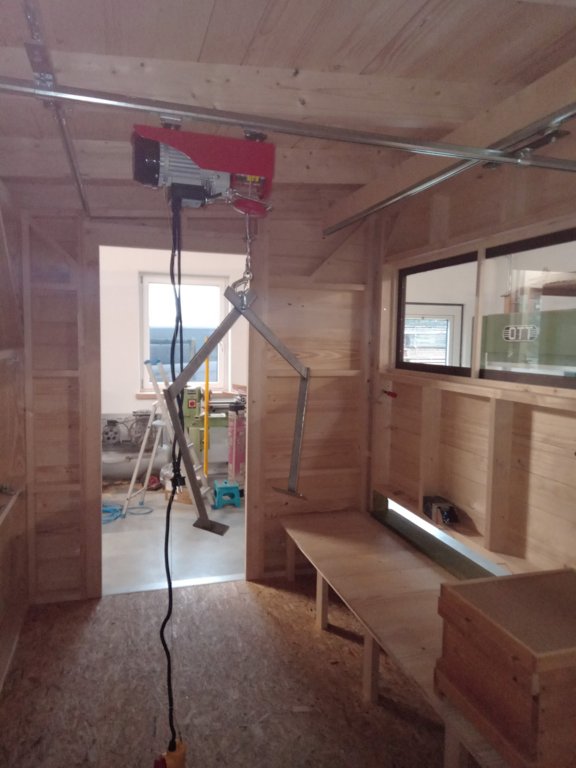 Ein Schienenleitsystem an der Decke mit motorisiertem Zug und Zangengreifer sorgt für rückenschonendes Arbeiten für bis zu zwei vollen Zargen auf Knopfdruck.