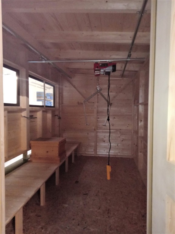10 Bienenvölker durften einziehen. Aufgeteilt in zwei Hälften wurde hier zur einen Seite der Bieneraum geplant, die andere Seite besteht zuerst aus einem gefliesten Schleuderraum mit Honigküche sowie einem weiteren Raum als Abstellfläche für die Imkermaterialien.
